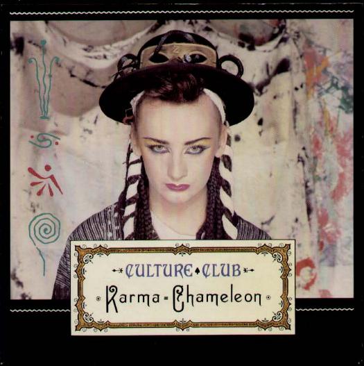 Kameleontti lähti siitä, että kynä muuttaa väriä asuun sopivaksi. Kameleontista tuli tietenkin mieleen Culture Clubin Karma Chameleon. Käytin hyödykseni seuraavia kuvia: Karma Chameleon, kameleontti ja kynä. Noita on sitten muokattu surutta photoshopilla. Käytetyt fontit ovat: Betty Noir (Suoraan Pariisista) ja Magneto (Missä ikinä olet...).